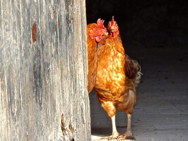 | Dos gallinas, curiosas, se asoman a nuestro paso. |